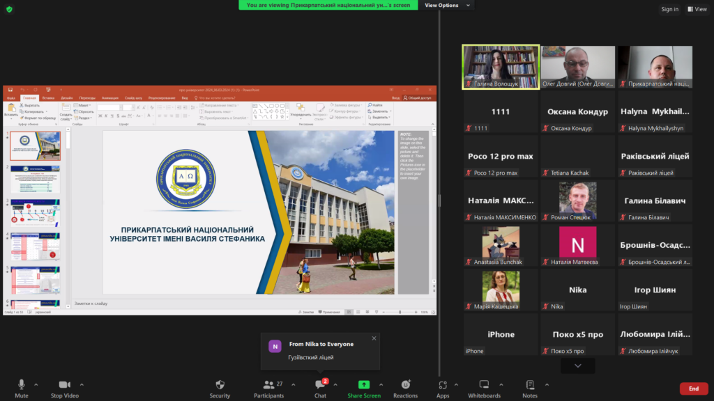 13 березня 2024 року в рамках проєкту «Університет для учнів» відбулася профорієнтаційна онлайн-зустріч викладачів Прикарпатського національного університету імені Василя Стефаника, зокрема кафедри початкової освіти, з учнями Раківського ліцею Брошнів-Осадської селищної ради, Міжрічанського, Болехівського та Гузіївського ліцеїв Болехівської міської ради.