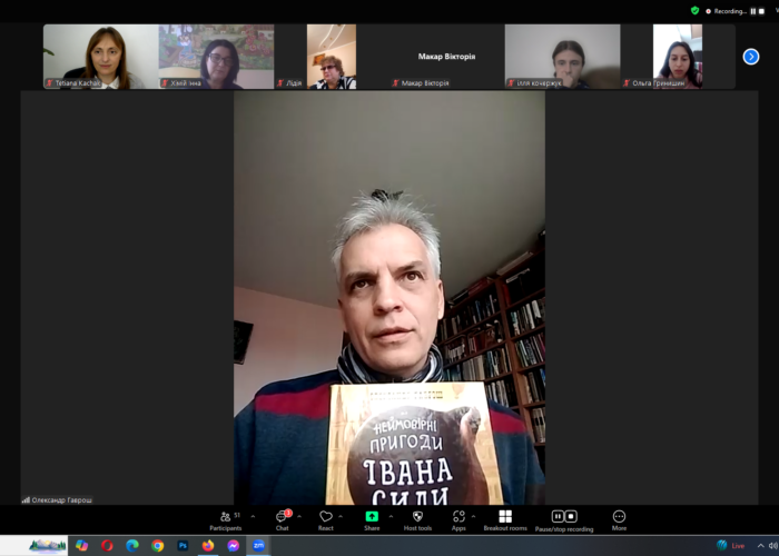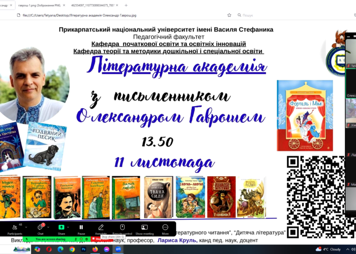 11 листопада у межах вивчення дисципліни «Дитяча література та методика навчання літературного читання» для студентів 3 курсу спеціальності «Початкова освіта» професорка кафедри початкової освіти та освітніх інновацій Тетяна Качак провела відкриту лекцію-діалог «Літературна академія з Олександром Гаврошем». Під час заняття учасники заходу познайомилися з сюжетом нової книжки – повісті-казки «Фортель і Мімі», обговорили різдвяну прозу, серію пригодницьких повістей «Музей пригод», згадали повісті про Івана Силу й розбійника Пинтю, з яких розпочалася історія популярності Олександра Гавроша як автора літератури для юних читачів. Цікавими міркуваннями про письменника, дитячу літературу та літературні контексти поділився доктор філологічних наук, професор Сидір Кіраль.