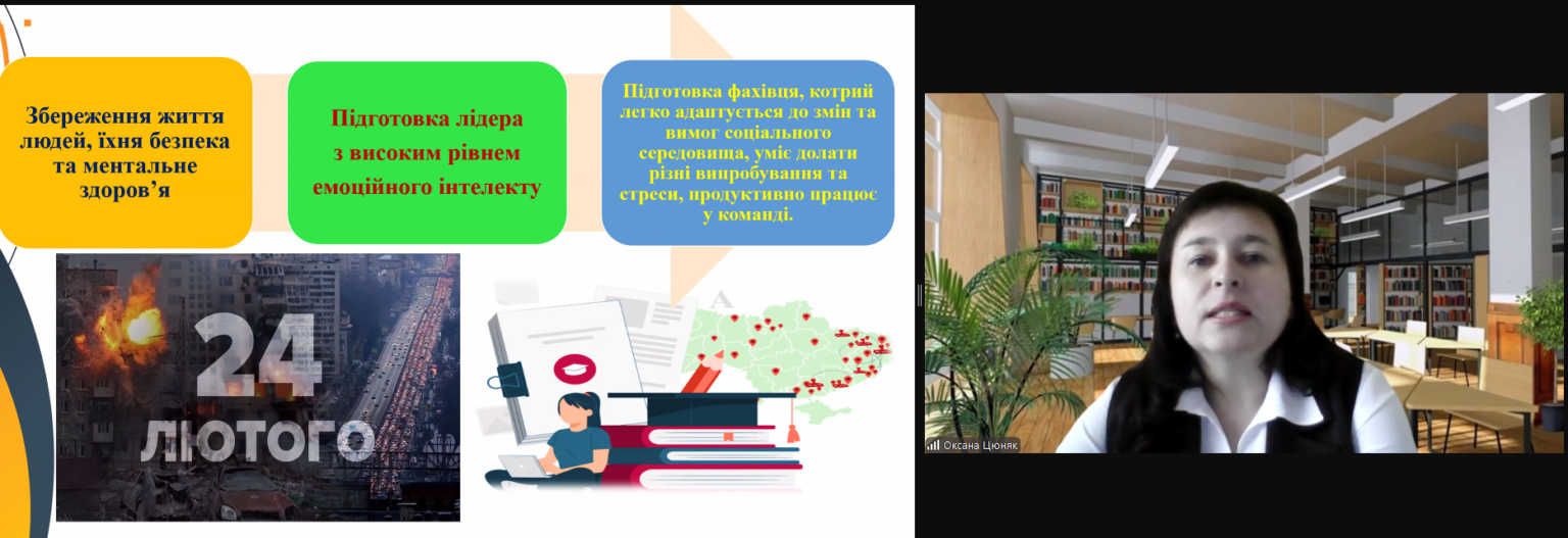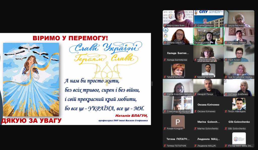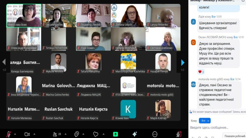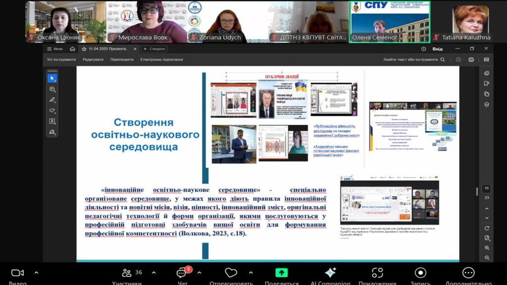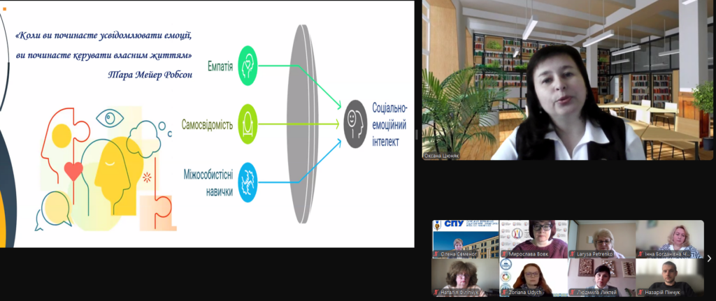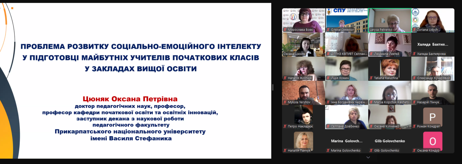 11 квітня 2025 року професорка кафедри початкової освіти та освітніх інновацій, заступниця декана з наукової роботи педагогічного факультету Оксана ЦЮНЯК взяла участь у вебінарі “Інновації у психолого-педагогічній підготовці майбутніх педагогів: зміст, технології, ресурси”, організованого Інститутом педагогічної освіти і освіти дорослих імені Івана Зязюна НАПН України у рамках Міжнародної виставки «Освіта та кар’єра – 2025». До вебінару долучилися декан Оксана КОНДУР, заступники декана Наталія КИРСТА і Ірина ДІДУХ, завідувачі кафедр, науково-педагогічні працівники педагогічного факультету, аспіранти, студенти та представники різних ЗВО.