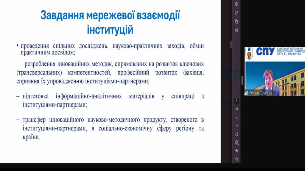 У своєму виступі доктор педагогічних наук, професор, професор кафедри педагогіки, керівник Центру науково-освітнього партнерства і мережевої взаємодії Сумського державного педагогічного університету імені А.С.Макаренка Олена СЕМЕНОГ відзначила активну співпрацю з академічною спільнотою нашого університету межах Об’єднання Інституцій-партнерів «Педагогічна синергія», ініційованого Інститутом педагогічної освіти і освіти дорослих імені Івана Зязюна НАПН України щодо реалізації спільних досліджень, проєктів і ініціатив, що сприяють якості освітнього процесу, зокрема в контексті сучасних викликів і потреб ринку праці. Професорка відзначила активну співдію із гарантом освітньо-наукової програми «Професійна освіта» Оксаною Цюняк, спрямовану на якісну підготовку майбутніх докторів філософії, що забезпечує високий рівень наукової та практичної підготовки майбутніх фахівців, здатних до інноваційної діяльності в освітньому середовищі.
