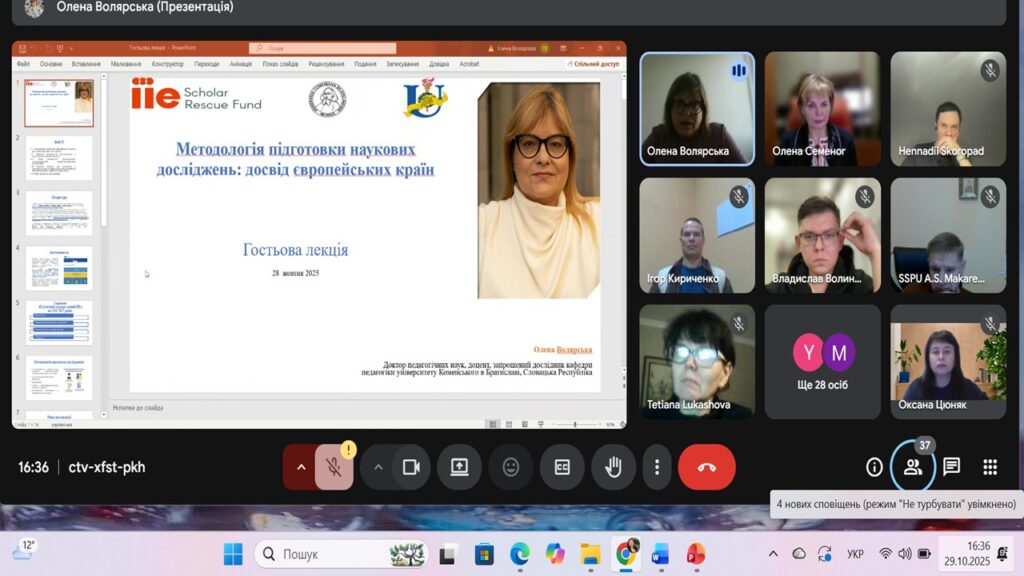 29 жовтня 2025 року аспіранти освітньо-наукової програми «Професійна освіта» разом із гарантом цієї програми професоркою Оксаною ЦЮНЯК взяли участь у міжнародній гостьовій лекції «Методологія підготовки наукового дослідження: досвід європейських країн», яку провела Олена ВОЛЯРСЬКА, докторка педагогічних наук, доцентка, дослідниця кафедри педагогіки філософського факультету Університету імені Яна Коменського у Братиславі (Словаччина) у межах Усеукраїнської онлайн-школи з міжнародною участю «Термінологічна культура фахівця».