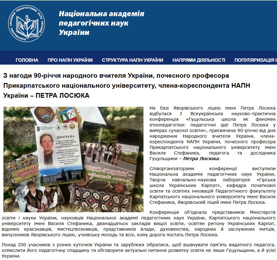 БУДІВНИЧИЙ ГУЦУЛЬСЬКОЇ ШКОЛИ – НАРОДНИЙ УЧИТЕЛЬ УКРАЇНИ, ПОЧЕСНИЙ ПРОФЕСОР УНІВЕРСИТЕТУ – ПЕТРО ЛОСЮК